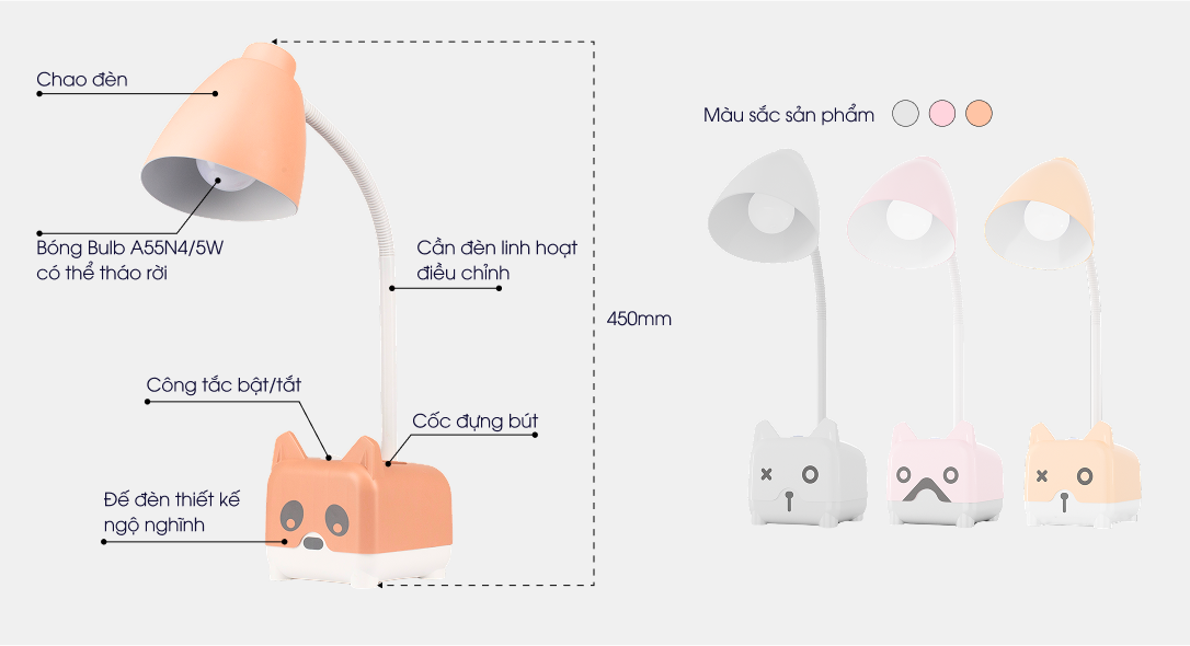 Sản phẩm có nguồn sáng nằm sâu trong chao, hạn chế chói lóa, không có hiện tượng nhấp nháy, giúp bảo vệ mắt và tăng sự tập trung khi học bài. Cần đèn cao, linh hoạt điều chỉnh góc chiếu, trường sáng, tránh hiện tượng khuất ánh sáng khi trẻ viết bài.