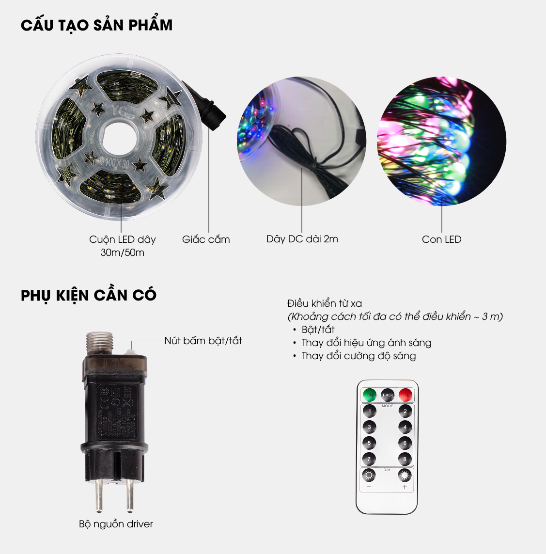 | Chế độ điều khiển | 1. Bật/tắt nguồn 2. Chế độ ánh sáng (8 chế độ) 3. Điều chỉnh độ sáng |