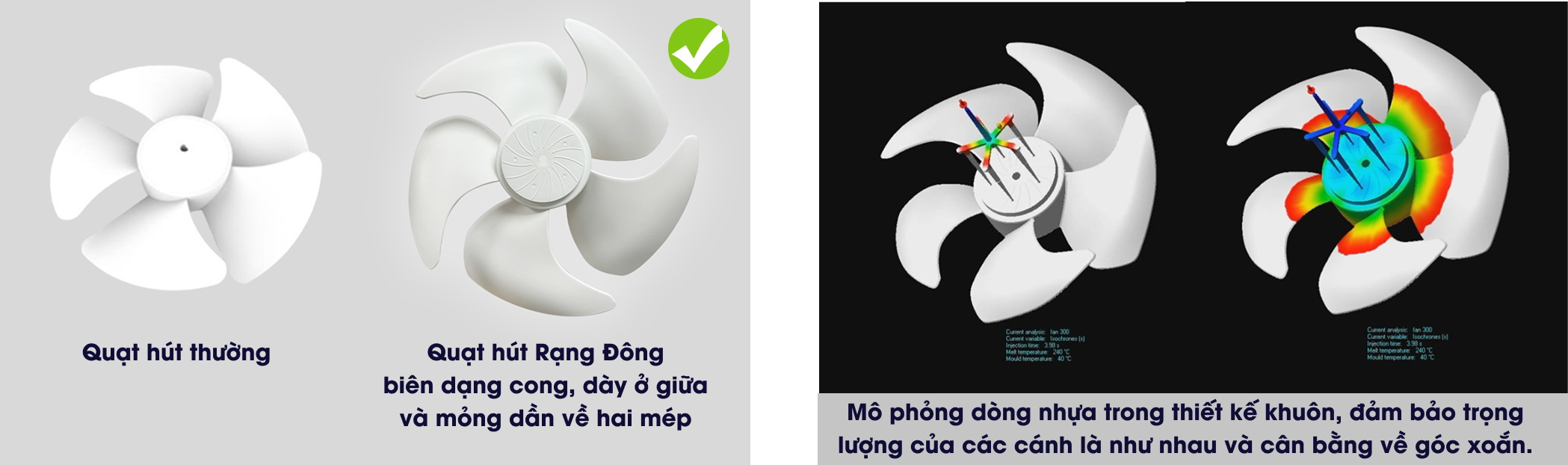 Bên cạnh cánh quạt, động cơ sử dụng vòng bi ở 2 đầu, dây quấn đồng và thân quạt nhựa PP gia cường bột Talc 10%, hấp thụ rung đóng vai trò quan trọng trong việc giảm ồn cơ học. Cánh và rotor đều được cân bằng động để hạn chế rung lắc, giúp quạt vận hành êm và ổn định. Sự kết hợp giữa tối ưu khí động học và tối ưu động cơ giúp quạt hút Rạng Đông giảm 15 - 25 dB so với quạt thiết kế truyền thống.