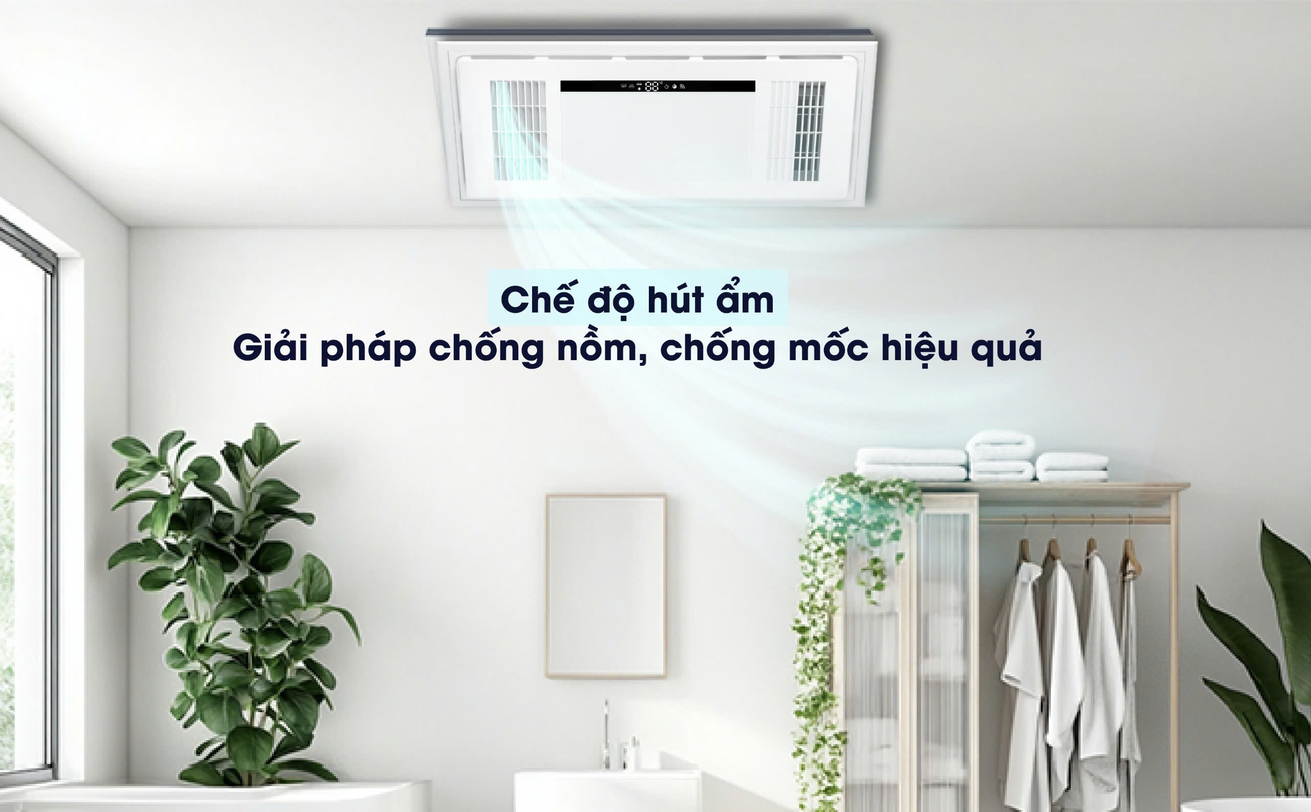 Nồm ẩm là kẻ thù số một của phòng tắm, đặc biệt tại miền Bắc. Đèn điều hòa phòng tắm xử lý triệt để vấn đề này nhờ công nghệ hút ẩm tự động 3 chu kỳ.Chức năng hút ẩm được thiết kế theo quy trình khép kín: làm nóng không gian bằng sưởi PTC khiến hơi nước bay hơi, quạt hút đưa hơi ẩm ra ngoài. Quá trình lặp lại 3 lần liên tiếp giúp phòng tắm khô hoàn toàn, hạn chế trơn trượt và nấm mốc. Đây là tính năng đặc biệt hiệu quả trong những ngày nồm ẩm miền Bắc.
