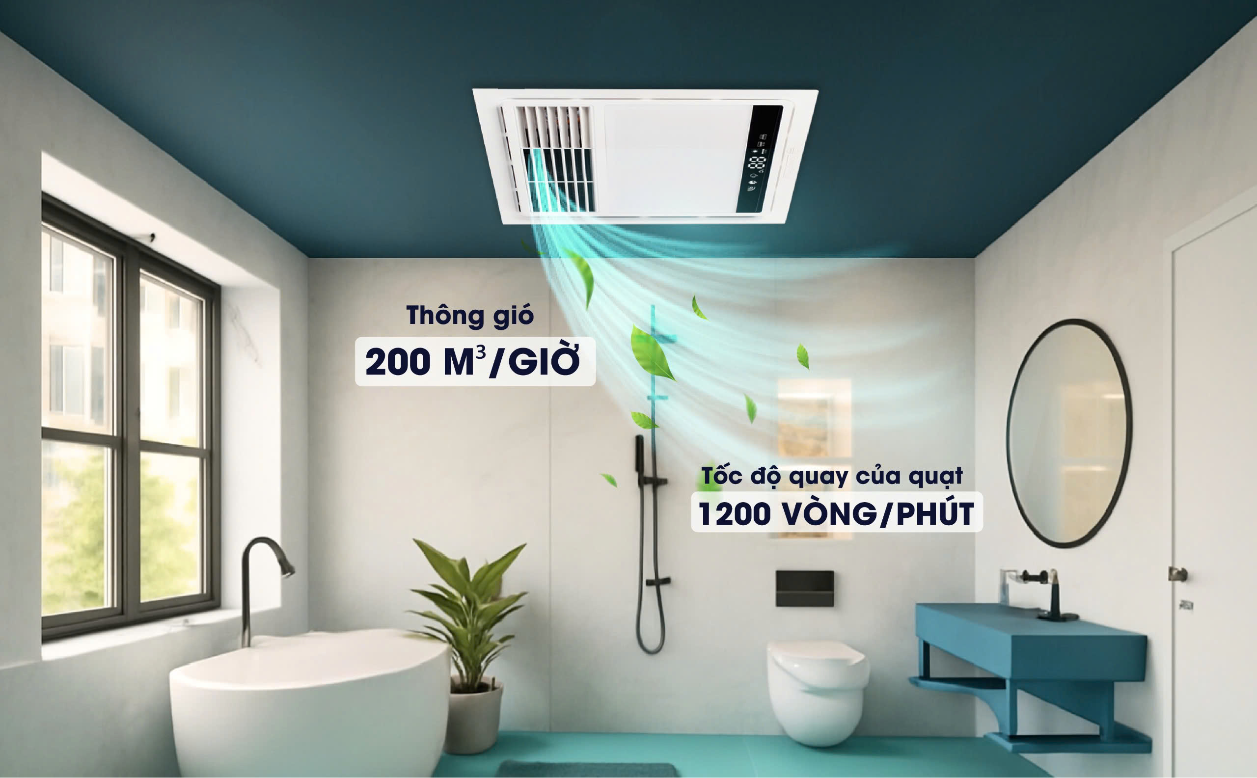 Không chỉ dùng trong mùa lạnh, đèn điều hòa phòng tắm còn hoạt động hiệu quả vào mùa hè nhờ chức năng quạt mát. Quạt làm mát với công suất 40W tốc độ quay 1200 vòng/phút tạo không gian mát mẻ nhanh, dễ chịu trong thời tiết mùa hè nắng nóng. Khi tắm nước nóng vào những ngày oi bức, quạt mát giúp giảm bí hơi, tăng lưu thông khí, tạo cảm giác thông thoáng kể cả trong không gian phòng tắm nhỏ và kín. Khi kết hợp với quạt hút, thiết bị giúp không khí tuần hoàn liên tục, mang đến trải nghiệm giống những phòng tắm khách sạn cao cấp.