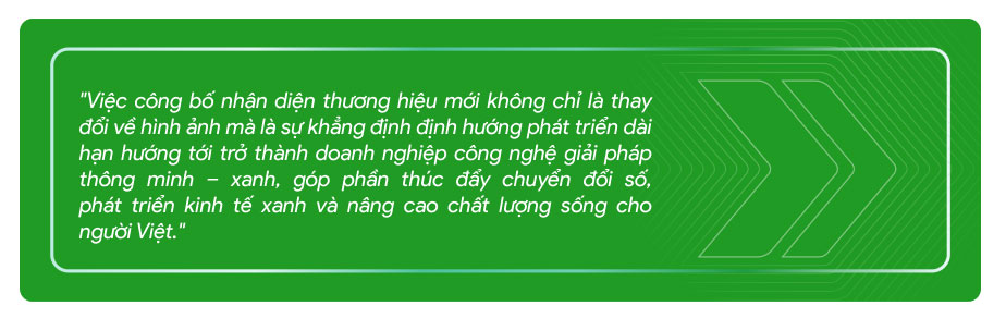 Yếu tố “Xanh” được thể hiện trong mũi tên cách điệu hướng về phía trước, tượng trưng cho sự vận động, lan tỏa của các giải pháp công nghệ thông minh.