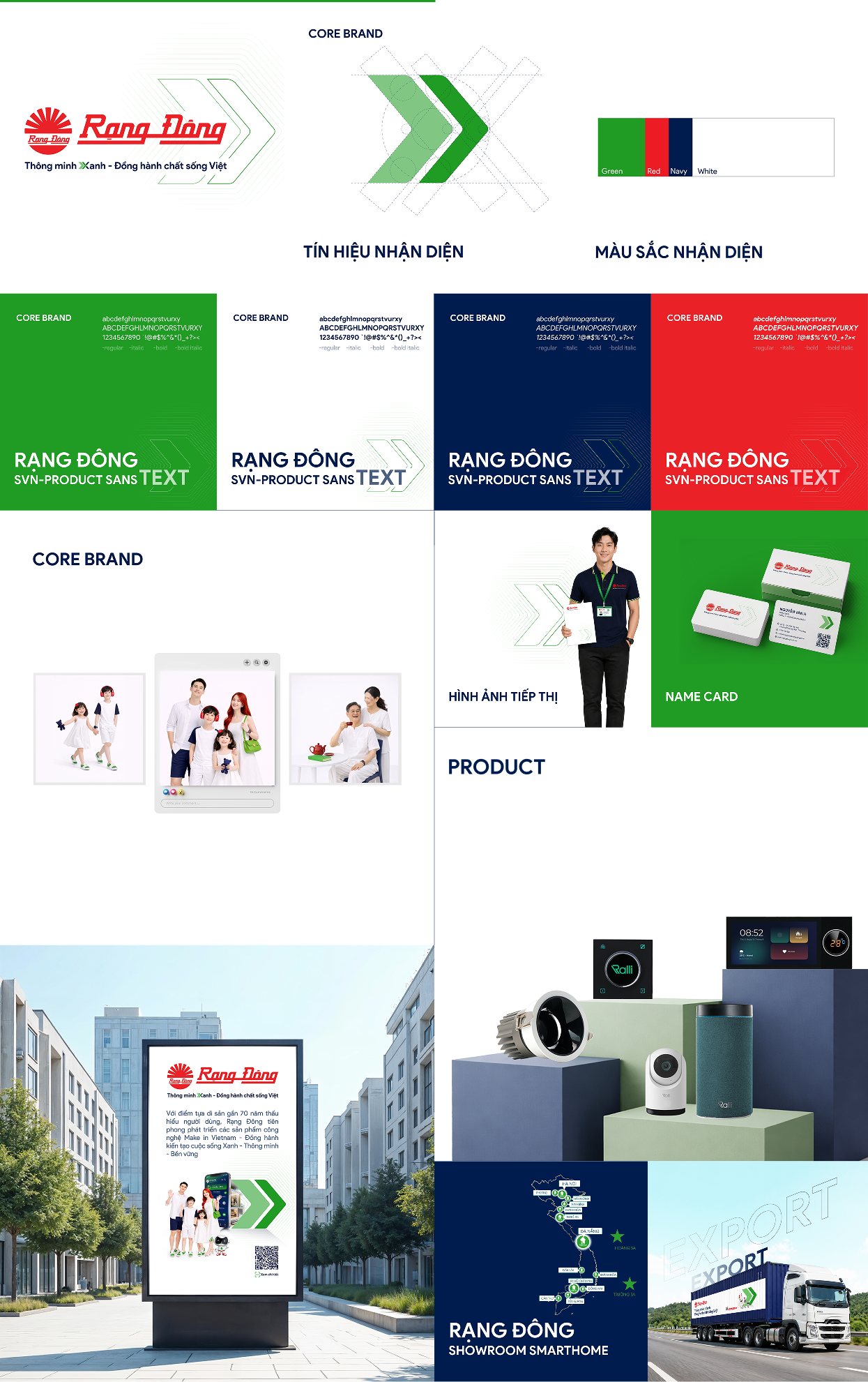 Trong bộ nhận diện thương hiệu mới của Rạng Đông, mặt trời đỏ - biểu tượng trung tâm - tiếp tục được giữ nguyên, đại diện cho nguồn năng lượng, niềm tin và di sản gần bảy thập kỷ đã xây dựng nên uy tín của một thương hiệu quốc dân. Yếu tố “Xanh” được cách điệu thành mũi tên tiến lên - biểu trưng cho sự vận động, bứt phá và lan tỏa của các giải pháp công nghệ thông minh đang dẫn lối tương lai.