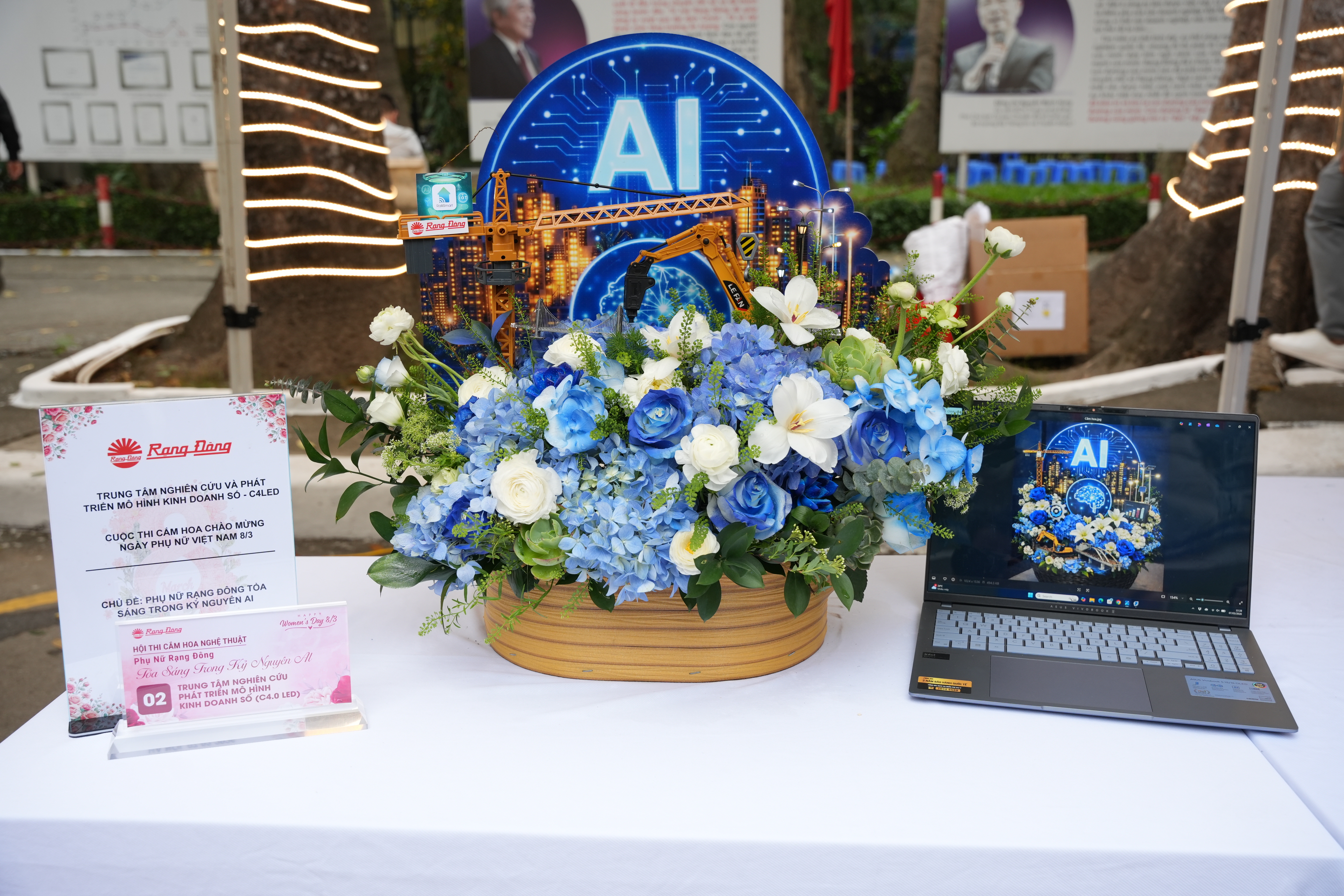Tác phẩm lãng hoa nghệ thuật với thông điệp ý nghĩa : "Phụ nữ Rạng Đông toả sáng trong kỷ nguyên AI - góp phần giúp công ty thực hiện chiến lược Tái tạo B trong việc đẩy mạnh lĩnh vực CTDA thuộc Top of Mind là Smart City Top 1 và Smart Indoor Top 1-2 với mục tiêu Doanh thu 2000 tỷ chiếm tỷ trọng 30%.